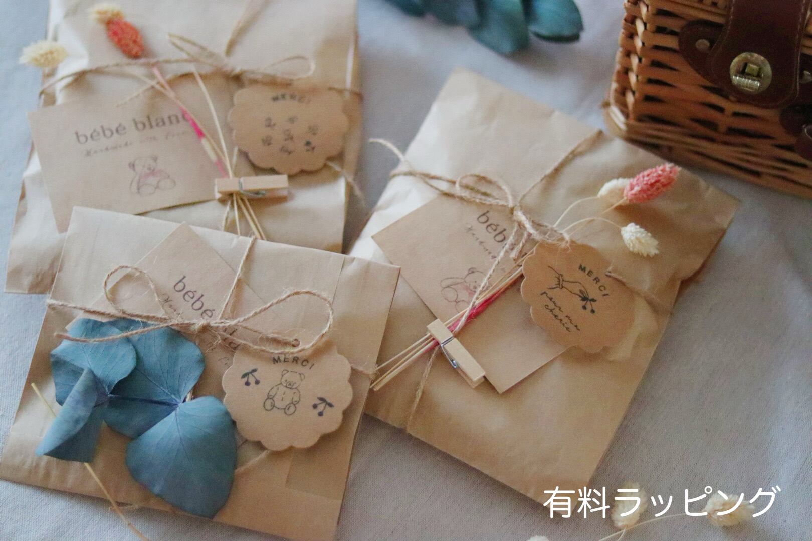 +150円で、ユーカリの葉や季節のドライフラワーを麻紐で結んでラッピングした、有料ラッピングの選択も可能です✧*。
